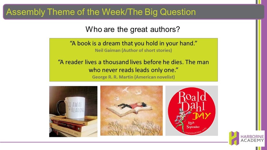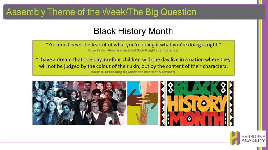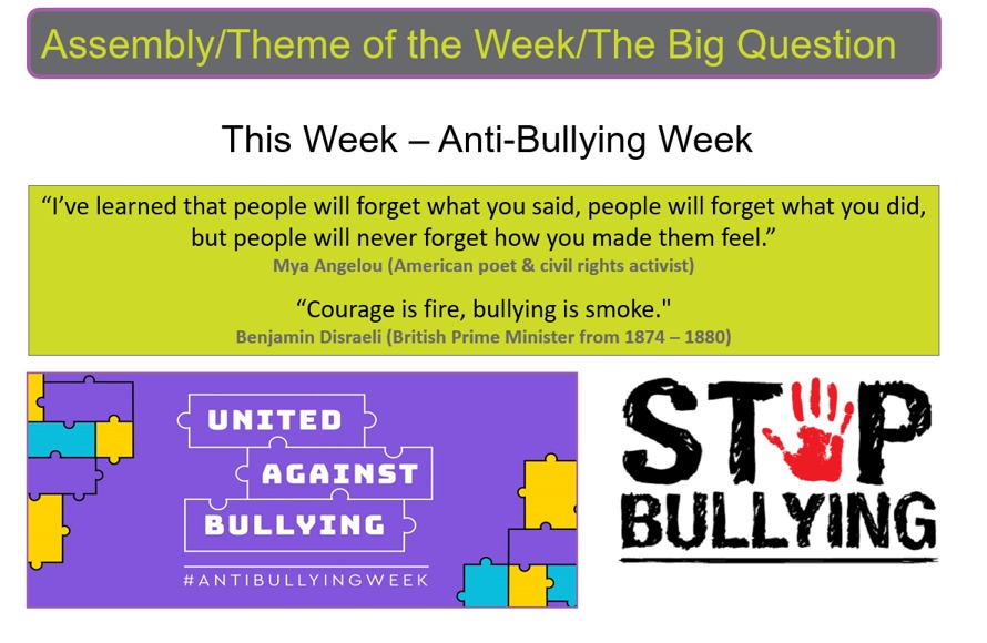 All students in the Academy have tutor time between 8.45am and 9.15am. There is a rolling carousel of activities that include Tutor Time Announcements, Form Time Reading, Current Affairs, PSHE and a year group assembly. Our assemblies each week usually centre around a ‘Big Question’ allowing students to learn and reflect on big issues and current affairs.